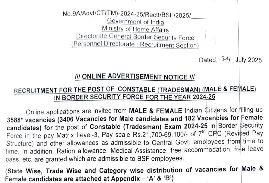 सीमा सुरक्षा बल (BSF) ने कांस्टेबल (ट्रेड्समैन) के 3588 पदों पर भर्ती का नोटिफिकेशन जारी कर दिया है। इच्छुक उम्मीदवार 23 अगस्त 2025 तक ऑनलाइन आवेदन कर सकते हैं। आवेदन में संशोधन की सुविधा 24 से 26 अगस्त 2025 तक उपलब्ध रहेगी।